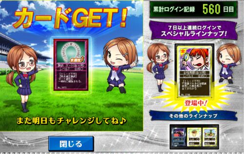 本日のログインボーナス 昨日の大感謝boxがダート蹄鉄でしたがまさかね? 最近のブログ更新頻度低下してますが競伝でのモチベ低下によるものなので今後も改善するということはよほどのことがない限りないかとおもわれます 運営の公式ブログも最後の更新から…
